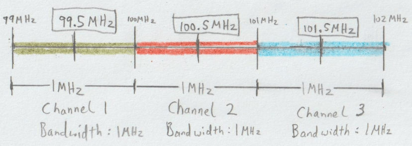 For example, compare a station at 99.5 MHz, 100.5 MHz, and 101.5 MHz. Each of these stations is separated by 1 MHz. Another way of saying this is their channel’s bandwidth is 1 MHz. This can be visualized like this:
